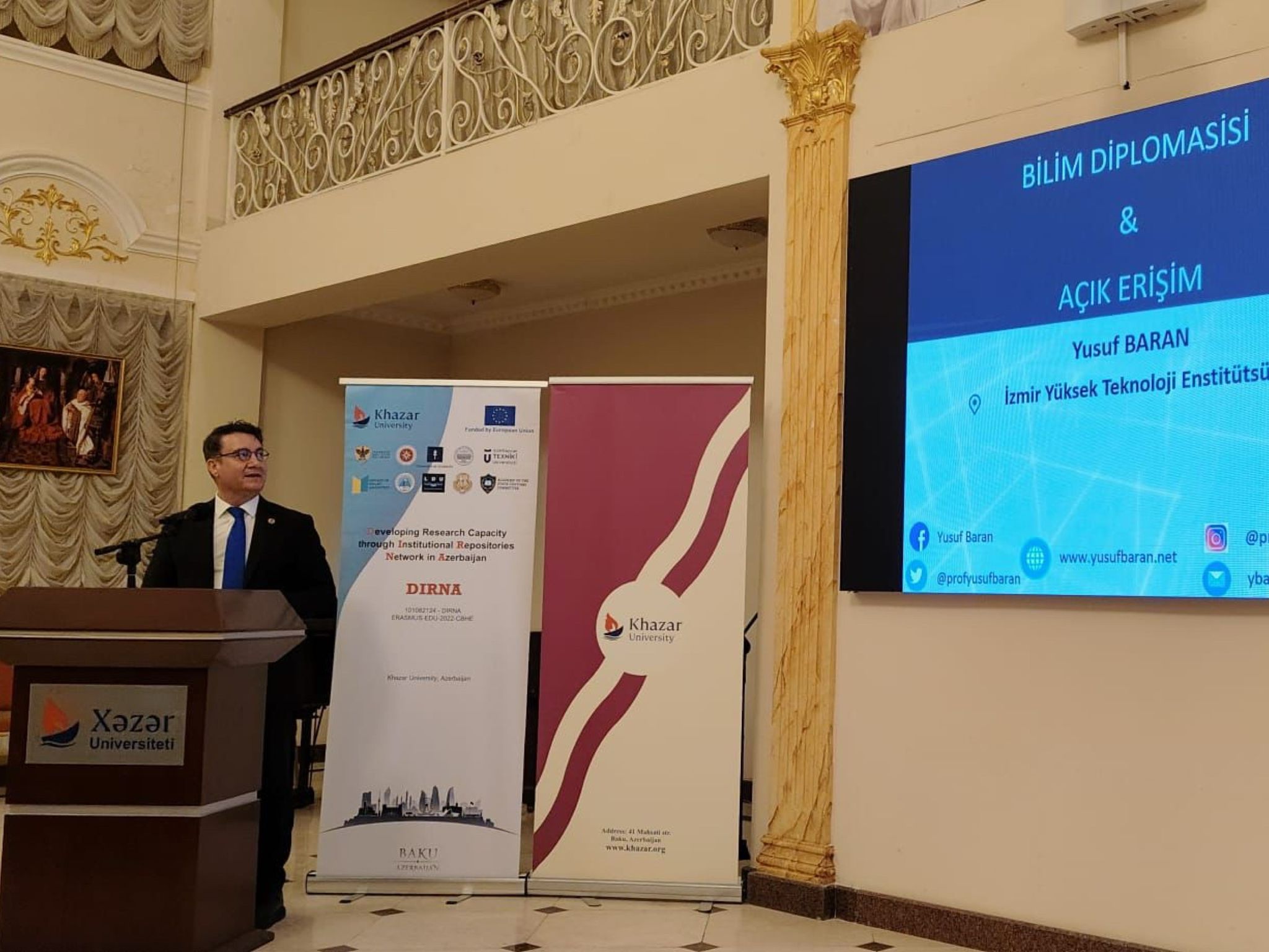 İYTE’nin ortağı olduğu “Azerbaycan’da Kurumsal Akademik Arşiv Ağı Aracılığıyla Araştırma Potansiyelinin Geliştirilmesi” (DIRNA) projesi kapsamında Khazar Üniversitesi’nde “Açık Erişim ve Bilim Diplomasisi” başlıklı bir konferans veren Rektör Baran, konferans bitiminde Khazar Üniversitesiyle Enstitü arasında iş birliğinin imzasını attı.