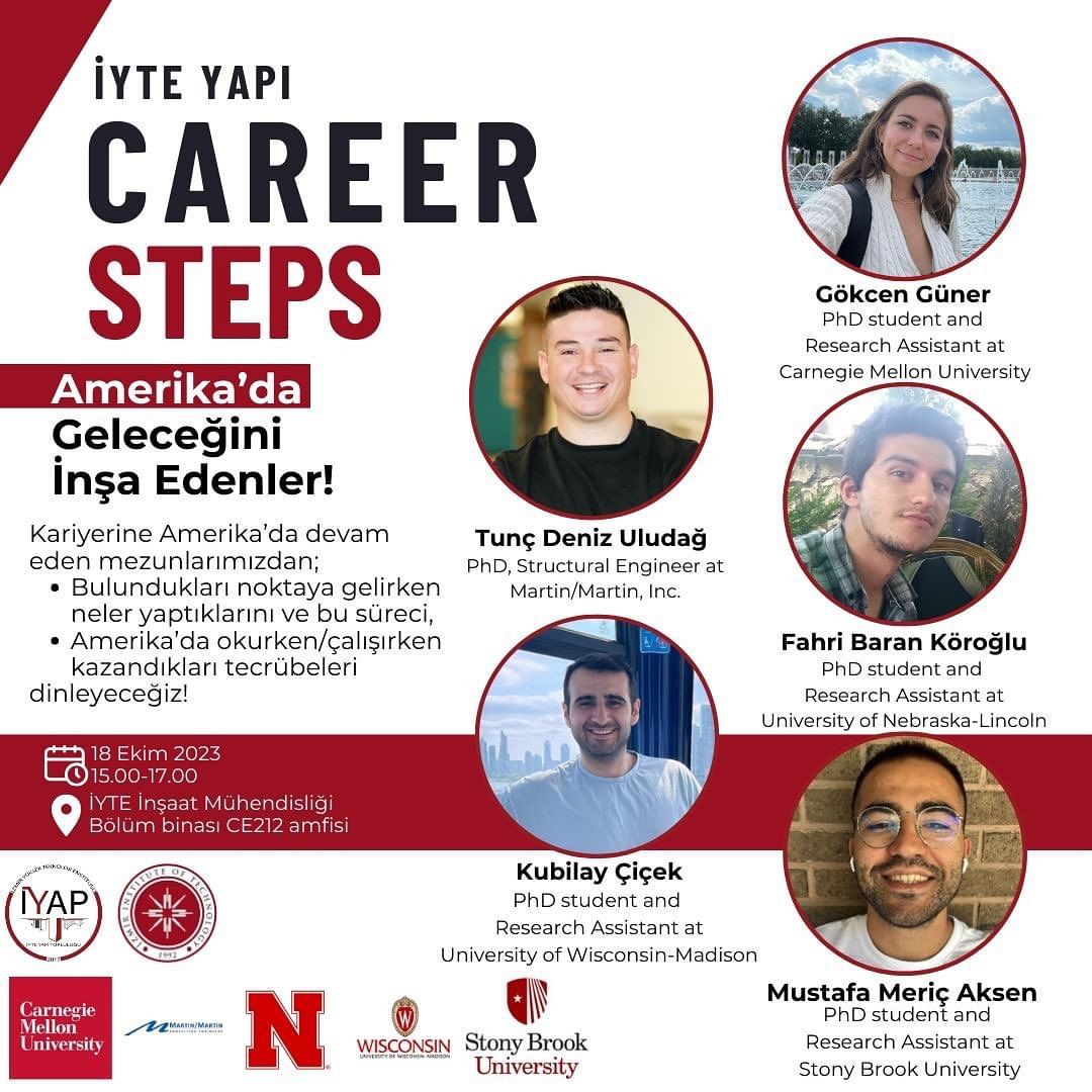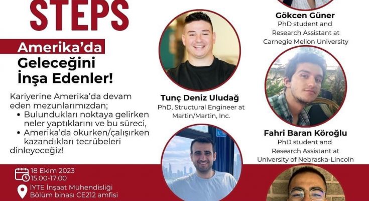 Bu dönem “Career Steps Amerika’da Geleceğini İnşa Edenler!” adıyla gerçekleştireceğimiz etkinliğimizin ilkinde konuklarımız online olarak katılırken bizler bir moderatör eşliğinde 18 Ekim 15.00 da  İnşaat Mühendisliği Bölümü Binası CE212 Amfisinde olacağız.